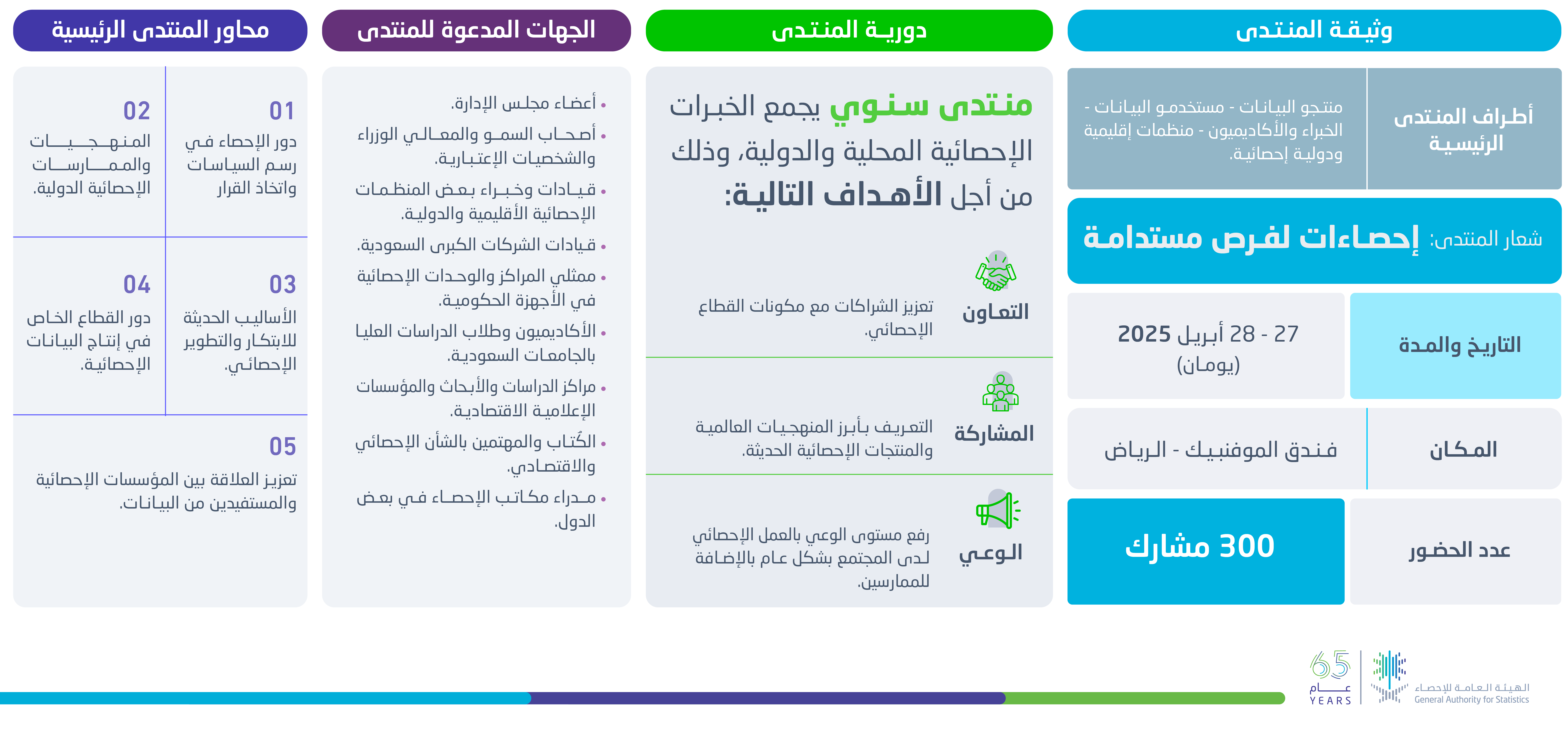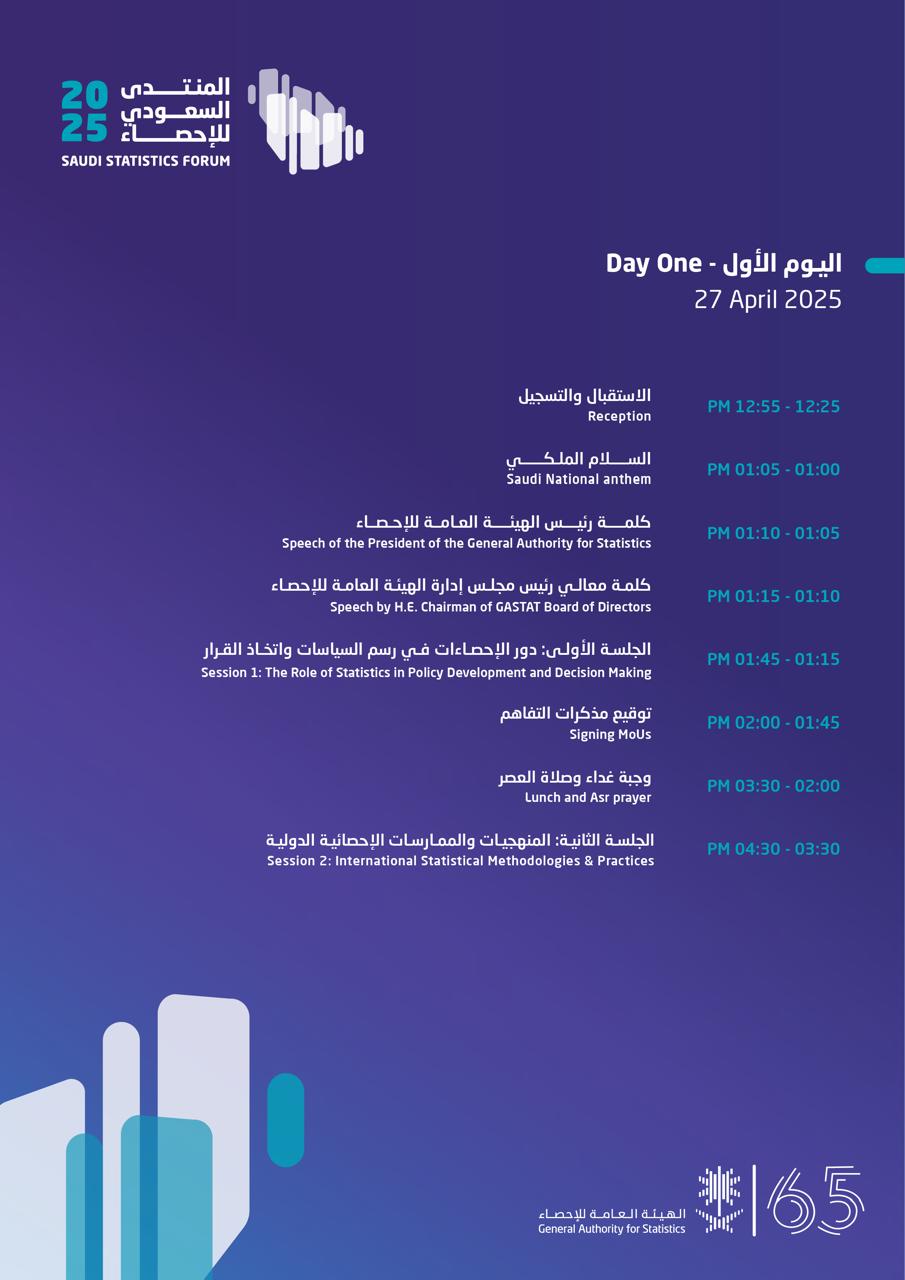 هو أول منتدى سعودي للإحصاء، وســــينعقد خلال الفترة من 27 إلــــى 28 إبريل 2025م فــــي العاصمة الرياض، تحت رعاية معالي وزير الاقتصاد والتخطيط رئيس مجلس إدارة الهيئة العامة للإحصاء، وبحضور ومشاركة عدد من أصحاب المعالي والسعادة، والخبراء والمتخصصين، ويستهدف مناقشة مواضيع مهمة علـــى الصعيد الإحصائي؛ وبيان الأثر الإيجابي لقطاع الإحصاء في دعم مســـيرة النهضة والتنمية المستدامة في المملكة، وقياس مستوى التقدم في مؤشرات رؤية الســـعودية 2030 ، وترســـيخ أهمية البيانات والإحصاءات في وعي أفراد المجتمع.