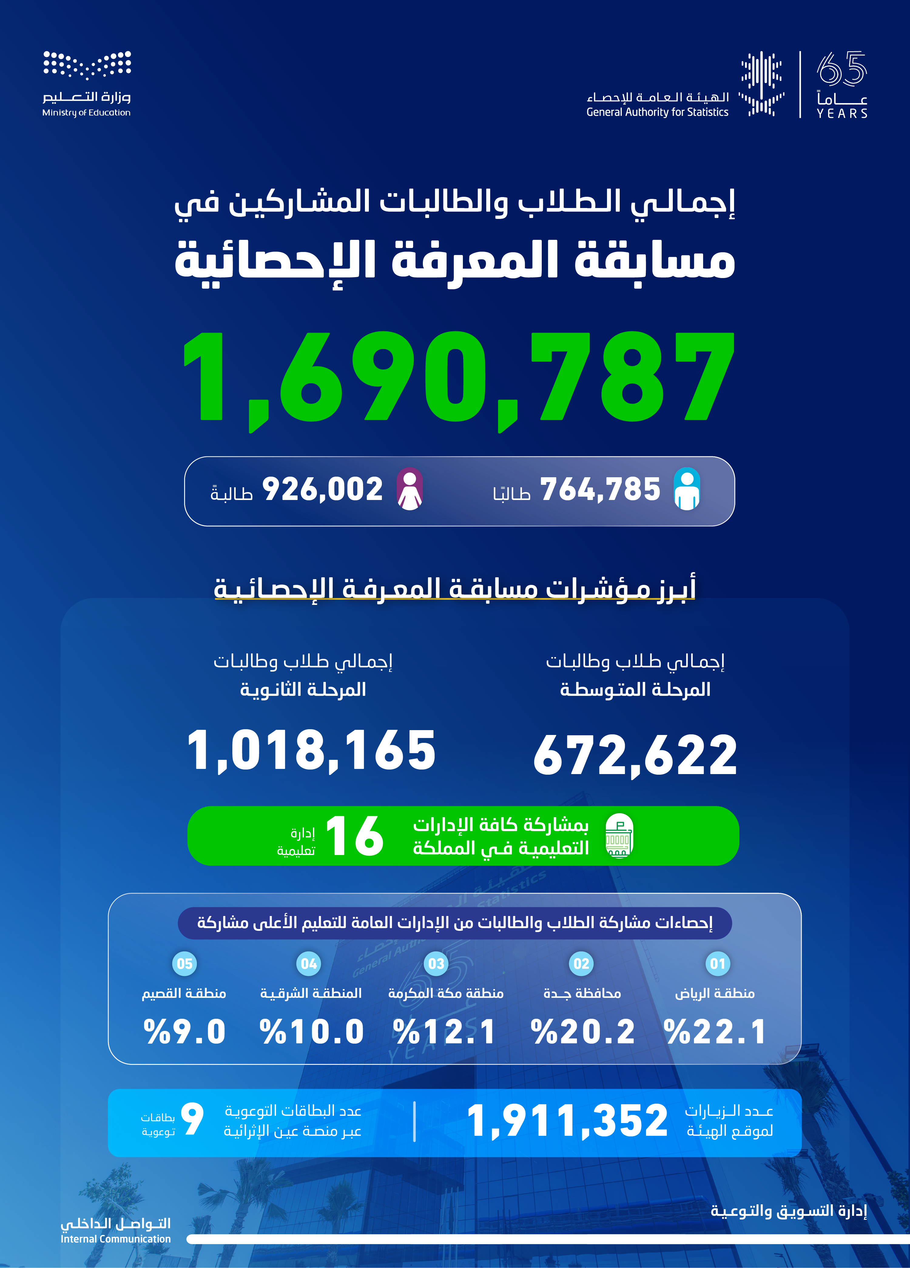 أعلنت الهيئة العامة للإحصاء نتائج النسخة الثانية من مسابقة المعرفة الإحصائية التي نفذتها بالتعاون مع وزارة التعليم، واستهدفت طلاب وطالبات المرحلتين المتوسطة والثانوية في جميع مدارس التعليم العام الحكومية والأهلية، والتي انطلقت في التاسع عشر من أكتوبر الماضي، واستمرت لمدة أسبوعين، وتزامنت مع الاحتفاء باليوم العالمي للإحصاء.