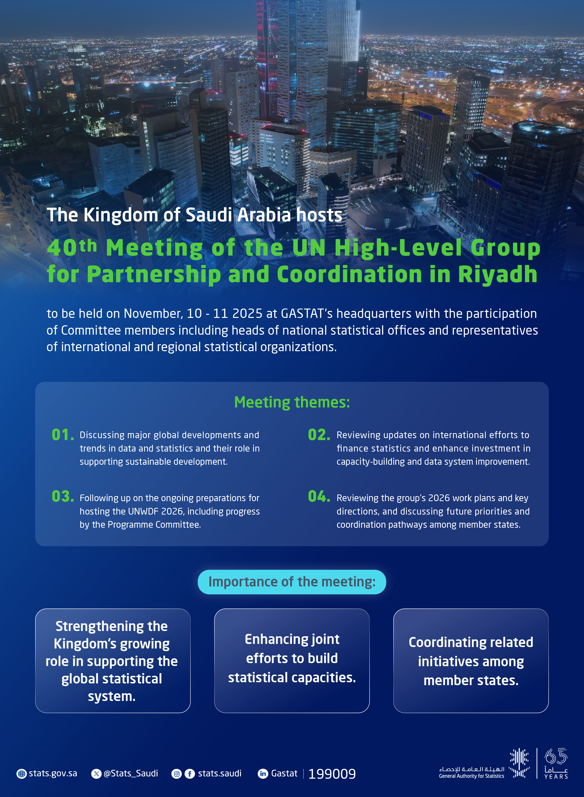 The Kingdom of Saudi Arabia, represented by the General Authority for Statistics (GASTAT), will host the 40th meeting of UN High-Level Group for Partnership, Coordination, and Capacity-Building for statistics related to the 2030 Sustainable Development Agenda (HLG-PCCB). The meeting will take place on November 10–11 2025 at GASTAT’s headquarters in Riyadh, with the participation of committee members, including heads of national statistical offices and representatives of international and regional statistical organizations. This global event reflects the Kingdom’s growing leadership in supporting the international statistical system and advancing joint efforts to develop statistical capacity, contributing to monitoring progress toward achieving the Sustainable Development Goals (SDGs), and coordinating related initiatives among member states.