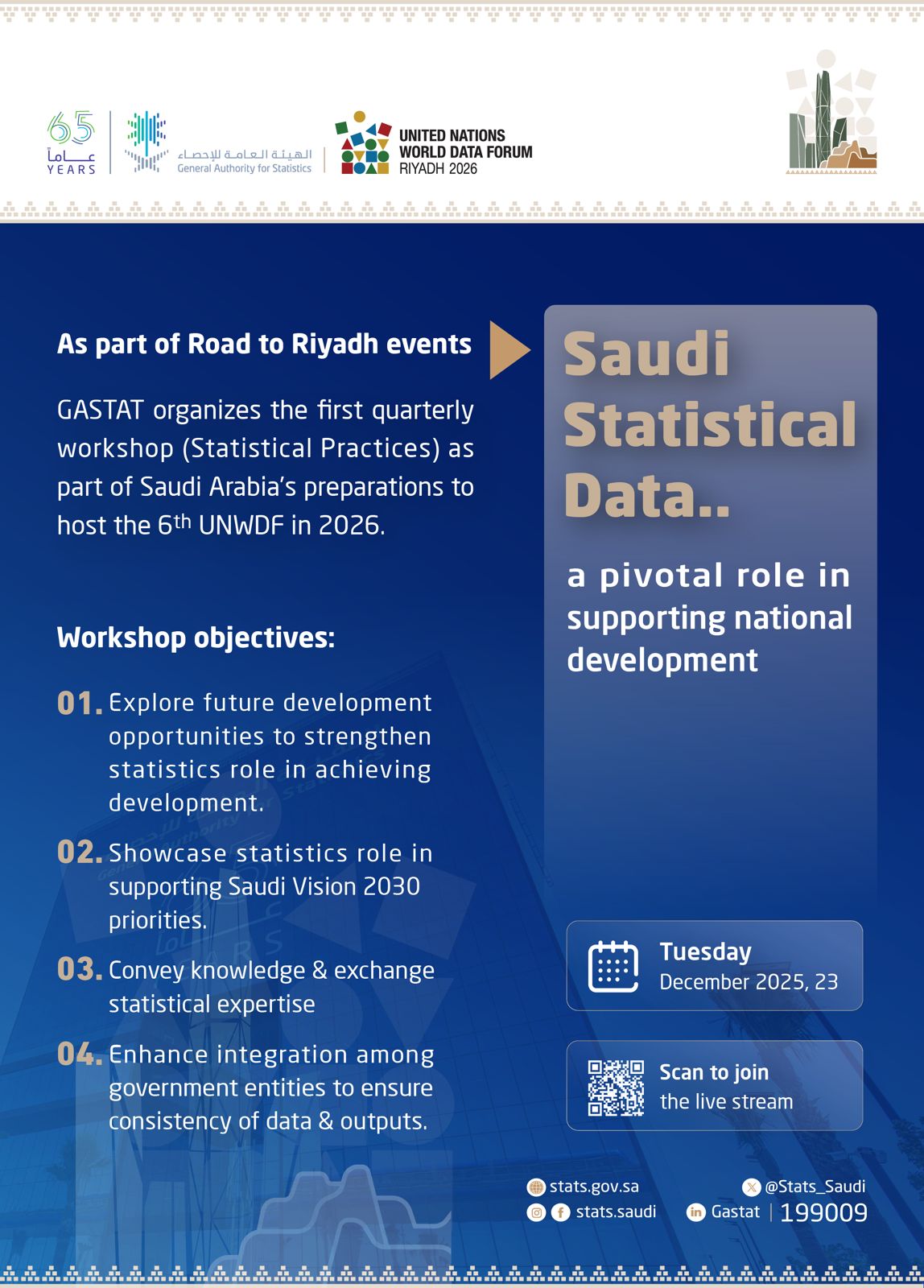 The General Authority for Statistics (GASTAT) will organize a panel discussion on Wednesday evening, 11 February 2026, titled “Beyond Numbers - The Social Dimensions of Data”. The panel discussion is part of a series of panel discussions previously held under Road to Riyadh events, launched in preparation for hosting the 6th UNWDF in Riyadh in November.
