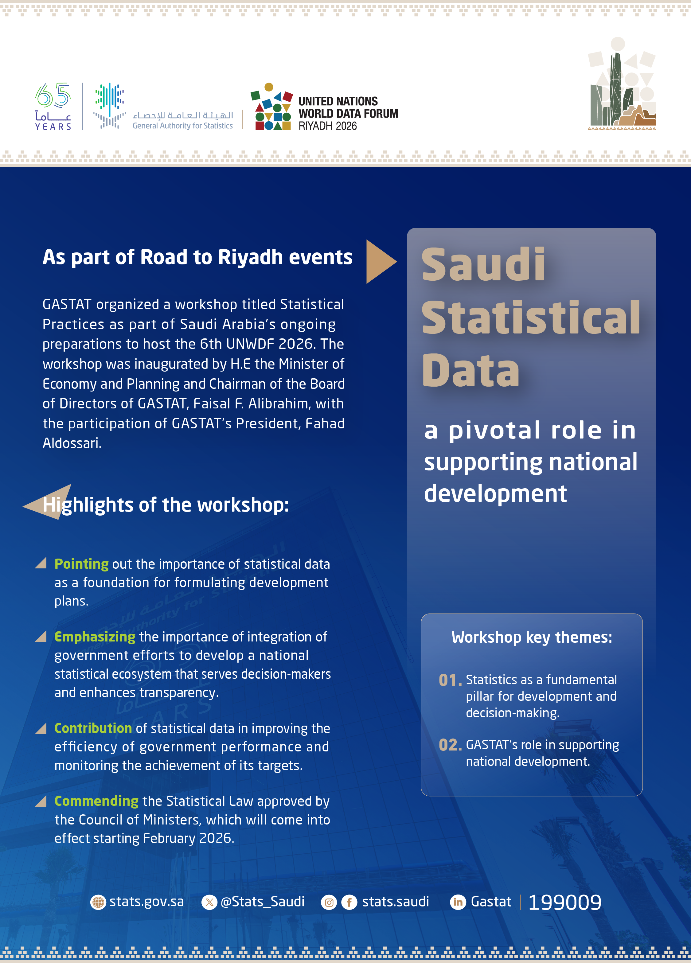 It is noteworthy that this workshop is part of a series of ongoing efforts by GASTAT within Road to Riyadh events, emphasizing Saudi Arabia’s readiness to host the 6th UNWDF in 2026 and reinforcing its leading role in the development of statistical work at both regional and international levels.