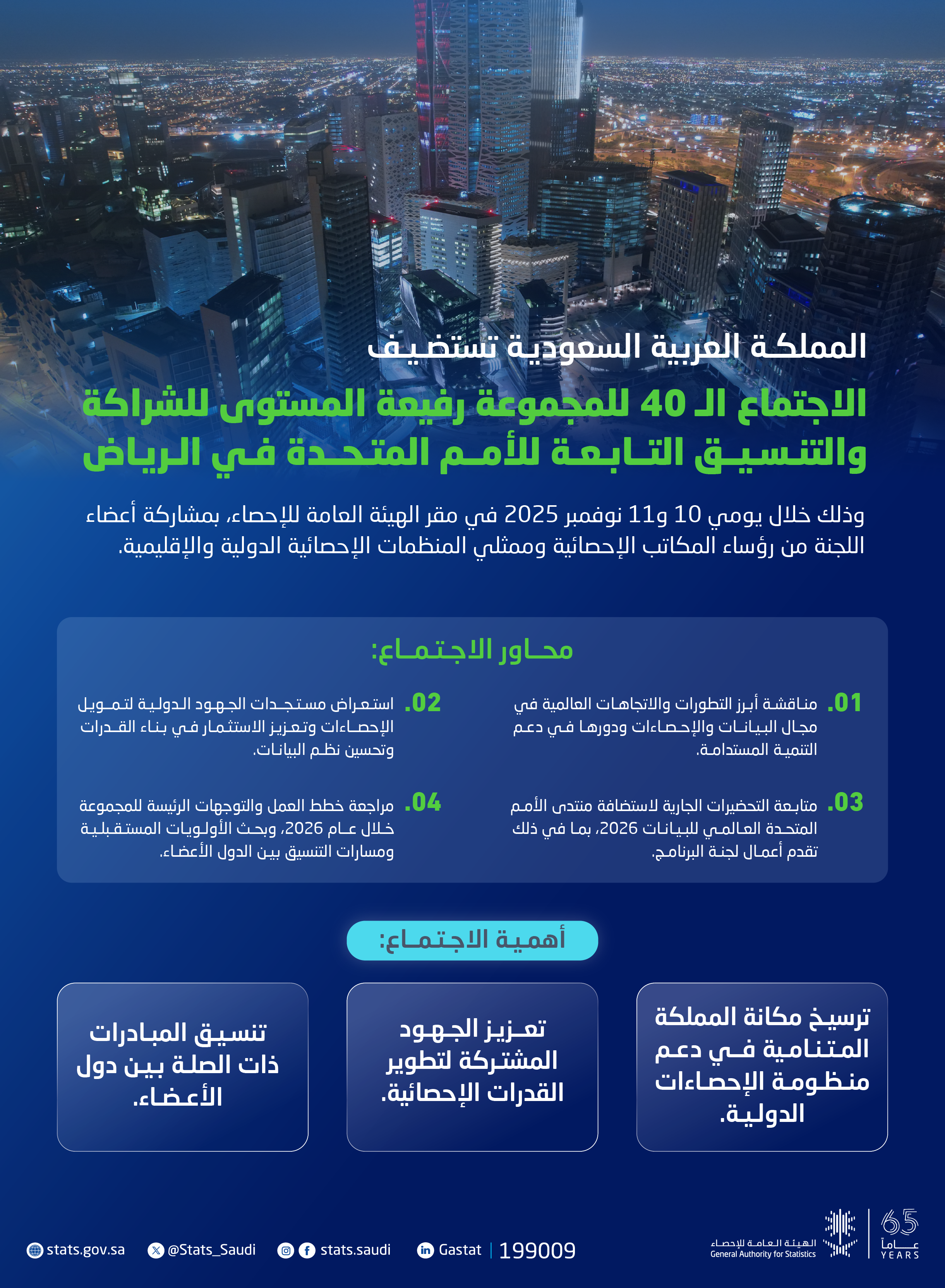 تستضيف المملكة العربية السعودية ممثلةً في الهيئة العامة للإحصاء الاجتماع الأربعين للمجموعة رفيعة المستوى المعنية بالشراكة والتنسيق وبناء القدرات في مجال الإحصاءات لأجندة التنمية المستدامة لعام 2030 (HLG-PCCB) التابعة للأمم المتحدة وذلك خلال يومي 10 و11 نوفمبر 2025 في مقر الهيئة بمدينة الرياض، بمشاركة أعضاء اللجنة من رؤساء المكاتب الإحصائية وممثلي المنظمات الإحصائية الدولية والإقليمية، حيث يأتي هذا الحدث الدولي في إطار مكانة المملكة المتنامية في دعم منظومة الإحصاءات الدولية وتعزيز الجهود المشتركة لتطوير القدرات الإحصائية بما يسهم في متابعة قياس التقدم نحو تحقيق أهداف التنمية المستدامة وتنسيق المبادرات ذات الصلة بين دول الأعضاء.