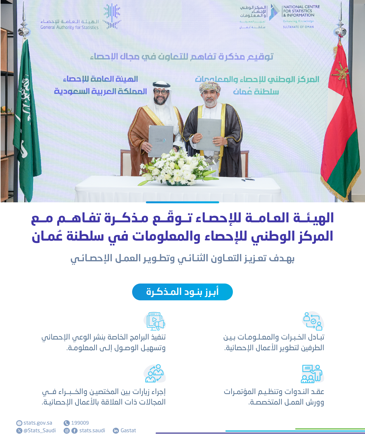 وقّعت الهيئة العامة للإحصاء مذكرة تفاهم مع المركز الوطني للإحصاء والمعلومات في سلطنة عُمان بهدف تعزيز التعاون الثنائي وتطوير العمل الإحصائي بين الجهتين، ومثل الطرفين في توقيع المذكرة كل من رئيس الهيئة العامة للإحصاء فهد بن عبد الله الدوسري، والرئيس التنفيذي للمركز الوطني للإحصاء والمعلومات د. خليفة بن عبد الله البرواني، بحضور سعادة سفير المملكة العربية السعودية بسلطنة عُمان الأستاذ إبراهيم بن سعد بن بيشان.
